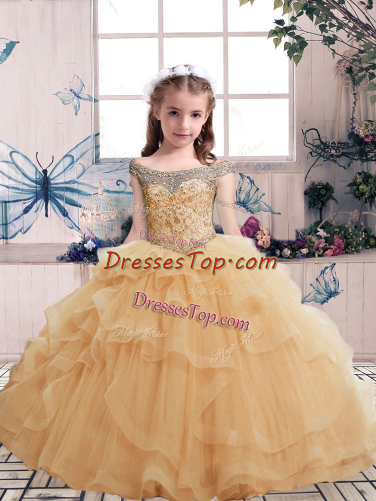 Attractive Champagne Ball Gowns Off The Shoulder Sleeveless Tulle Floor Length Lace Up Beading and Ruffles Child Pageant Dress