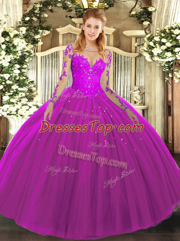 Attractive Fuchsia Long Sleeves Lace Floor Length Quince Ball Gowns