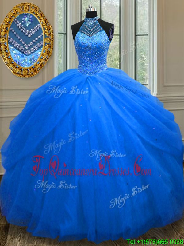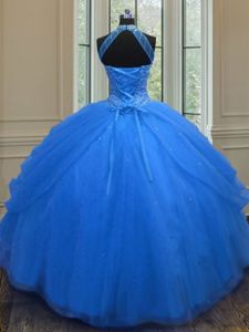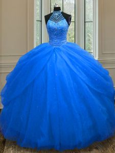 Attractive Halter Top Sleeveless Tulle Floor Length Lace Up Quinceanera Dress in Royal Blue for with Beading