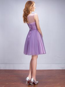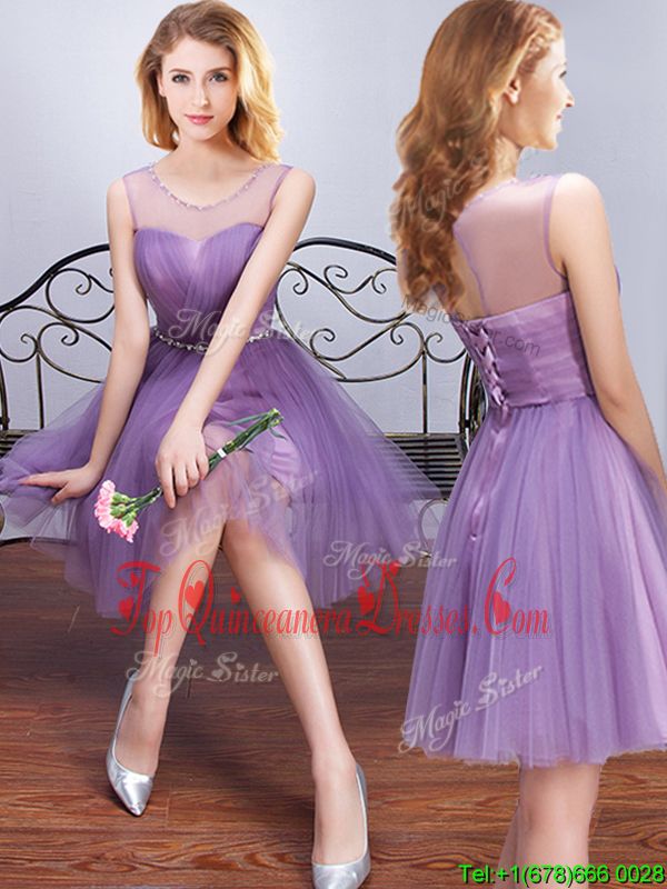 Attractive Lavender Scoop Lace Up Beading and Ruching and Belt Quinceanera Court of Honor Dress Sleeveless