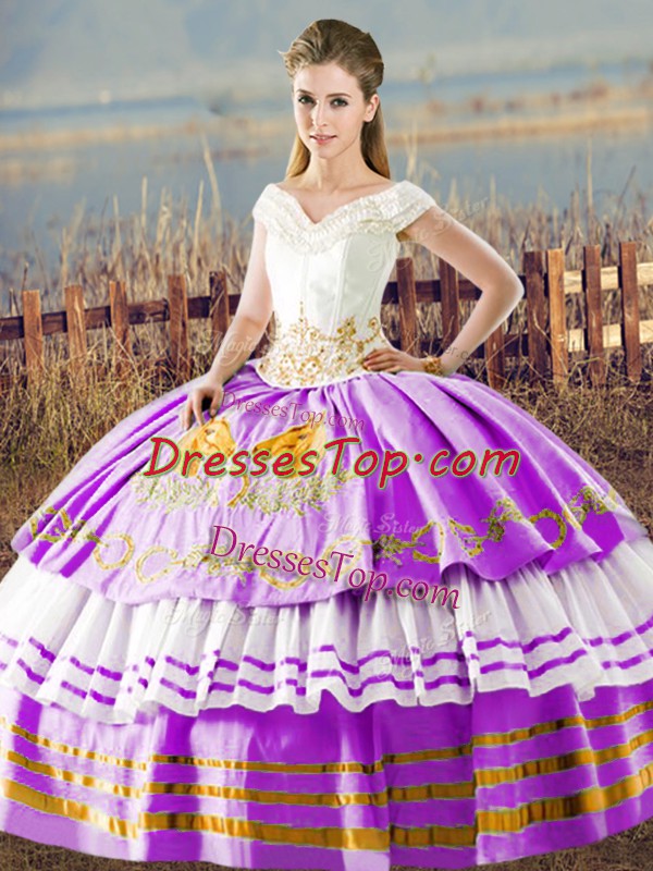 Attractive Lilac Ball Gowns Embroidery and Ruffled Layers 15 Quinceanera Dress Lace Up Organza Sleeveless Floor Length