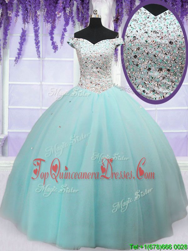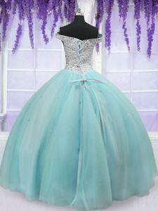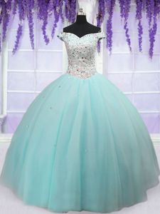 Attractive Off the Shoulder Short Sleeves Floor Length Beading Lace Up Ball Gown Prom Dress with Light Blue