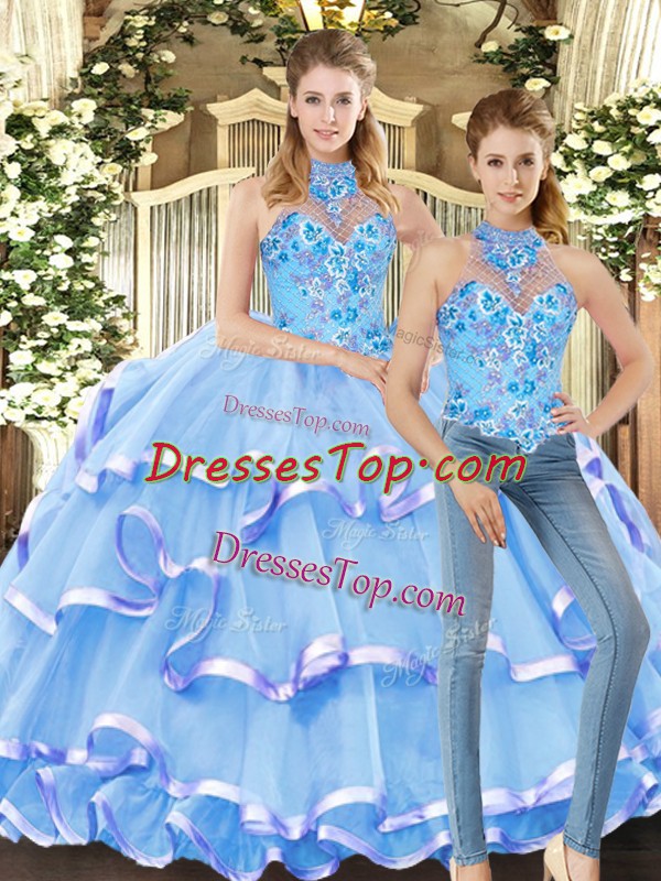 Attractive Organza Halter Top Sleeveless Lace Up Embroidery and Ruffled Layers Quinceanera Dresses in Blue
