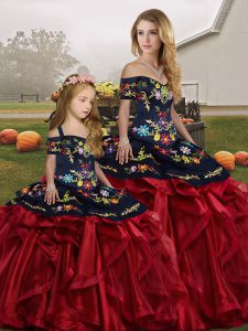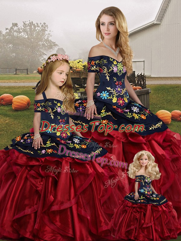 Attractive Organza Off The Shoulder Sleeveless Lace Up Embroidery and Ruffles Quinceanera Dresses in Red And Black