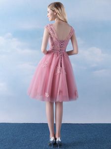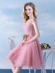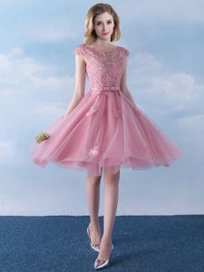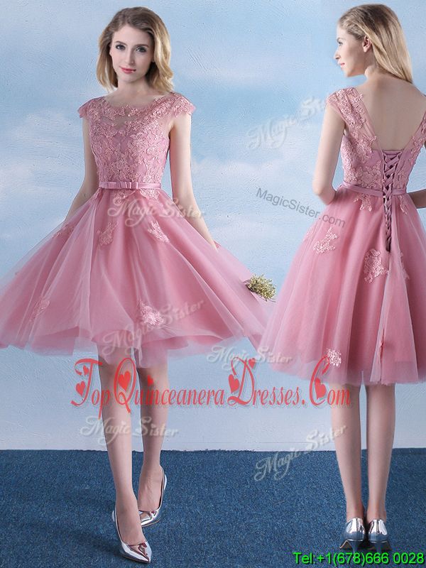 Attractive Scoop Tulle Cap Sleeves Knee Length Damas Dress and Appliques and Belt
