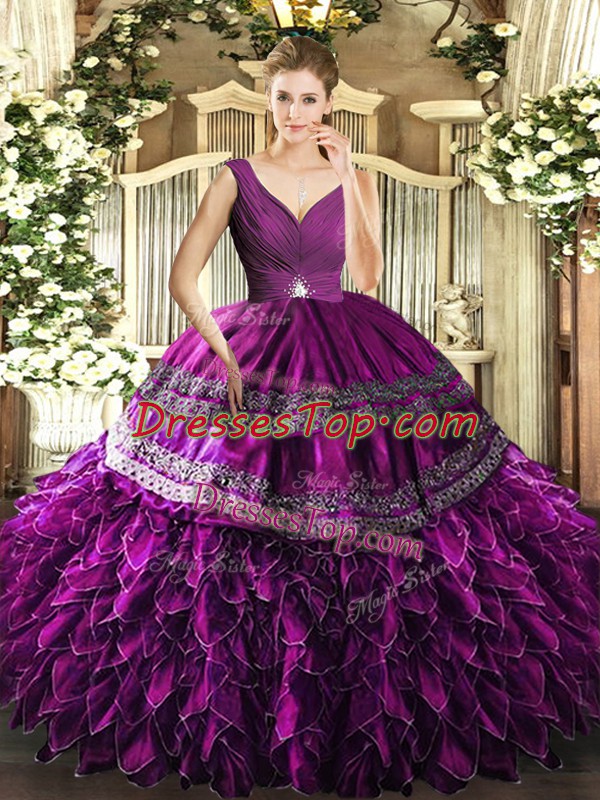 Attractive V-neck Sleeveless Backless Quinceanera Gowns Purple Organza