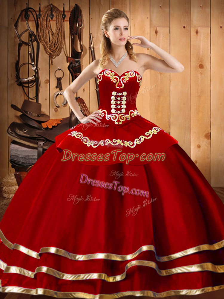 Attractive Wine Red Ball Gowns Embroidery Ball Gown Prom Dress Lace Up Organza Sleeveless Floor Length