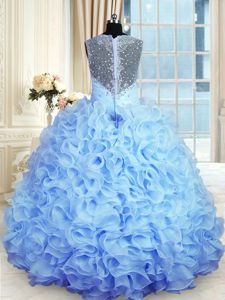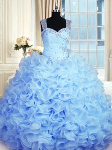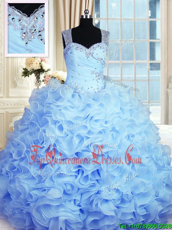 Baby Blue Ball Gowns Straps Sleeveless Organza Floor Length Zipper Beading and Ruffles Sweet 16 Dress