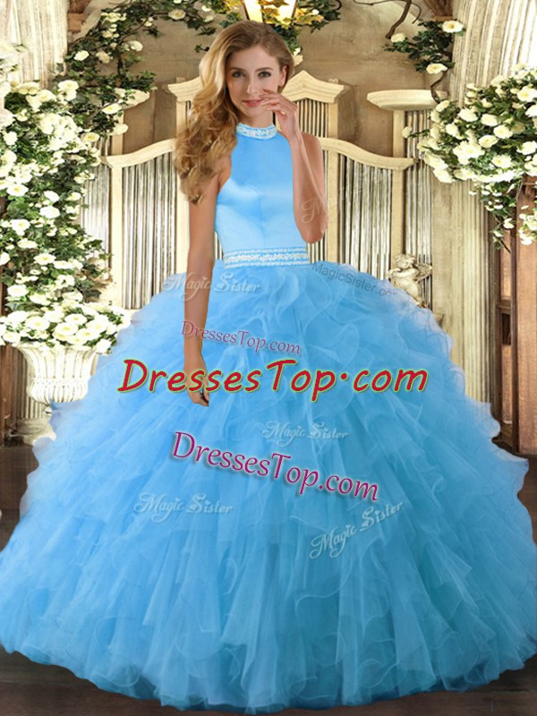 Baby Blue Halter Top Neckline Beading and Ruffles Quince Ball Gowns Sleeveless Backless
