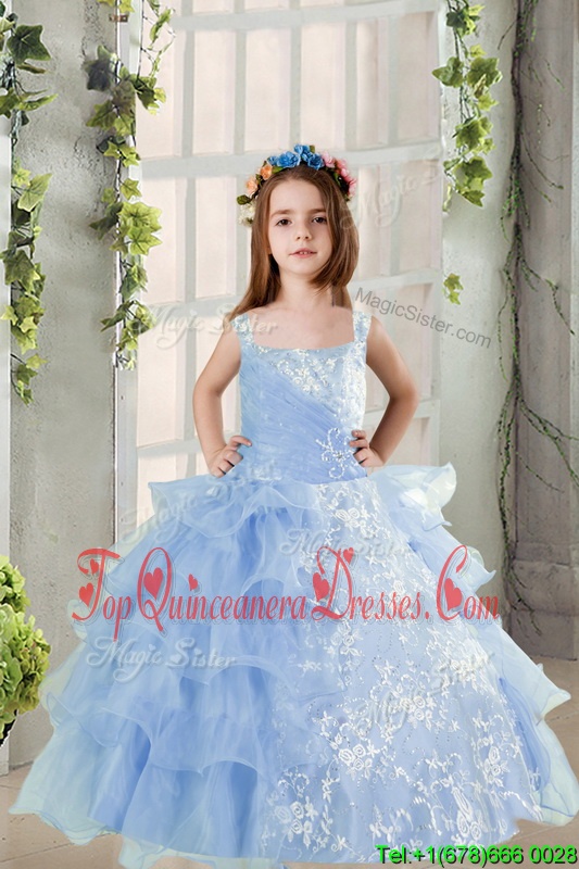 Baby Blue Long Sleeves Lace and Ruffled Layers Floor Length Child Pageant Dress