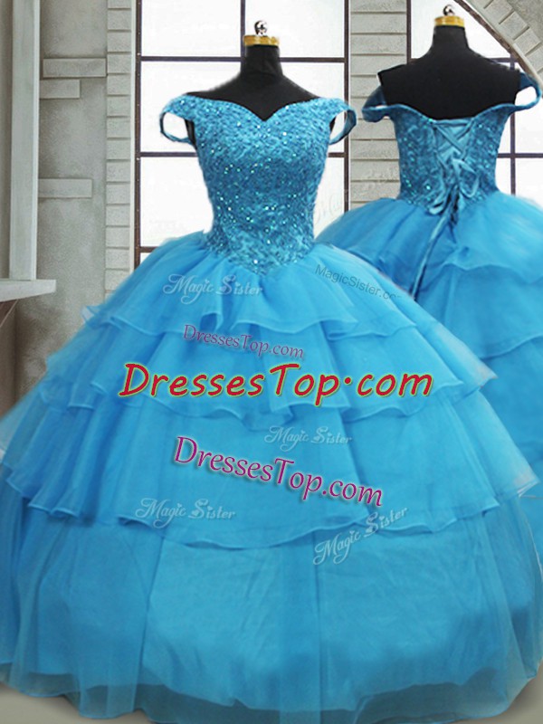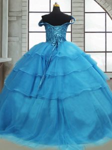 Baby Blue Off The Shoulder Neckline Beading and Ruffled Layers Quinceanera Dress Sleeveless Lace Up