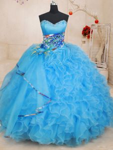 Baby Blue Organza Lace Up Sweetheart Sleeveless Floor Length Sweet 16 Dress Beading and Ruffles and Pattern