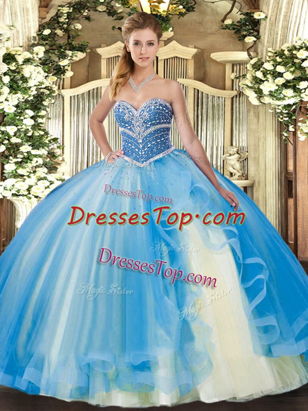 Baby Blue Sleeveless Floor Length Beading and Ruffles Lace Up Quinceanera Dresses