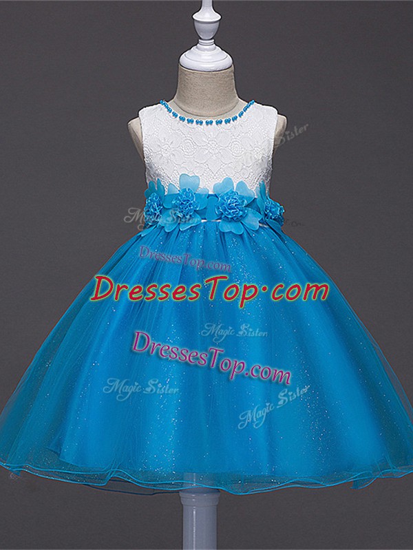 Baby Blue Sleeveless Lace and Hand Made Flower Knee Length Little Girls Pageant Dress Wholesale