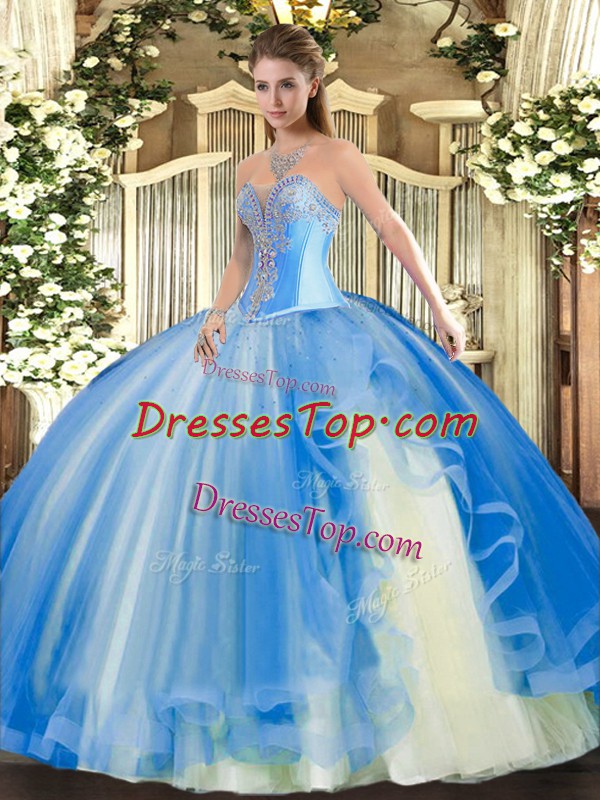 Baby Blue Sweetheart Neckline Beading and Ruffles Vestidos de Quinceanera Sleeveless Lace Up