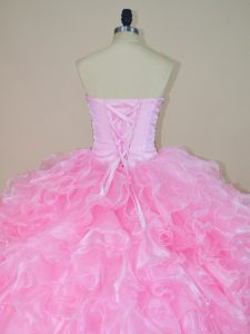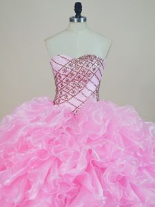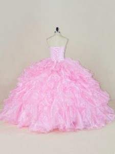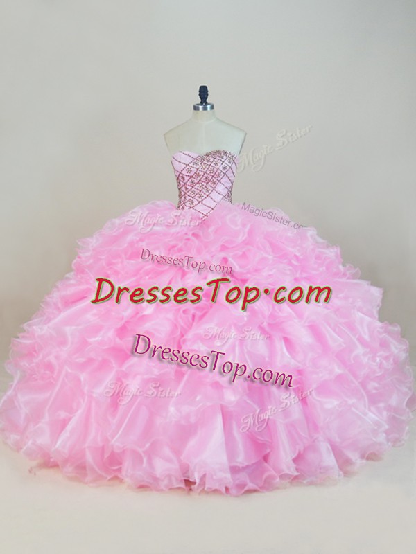 Baby Pink Ball Gown Prom Dress Sweet 16 and Quinceanera with Beading and Ruffles Sweetheart Sleeveless Lace Up