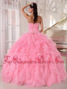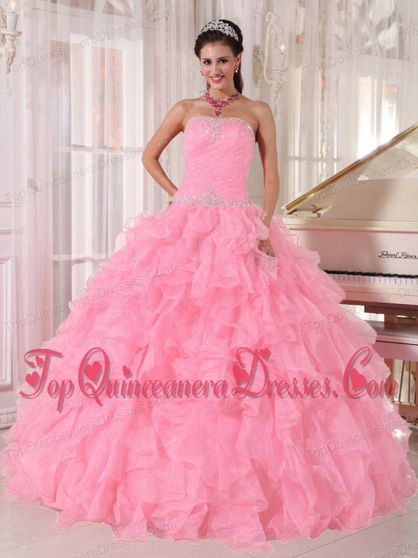 Baby Pink Ball Gown Strapless Floor-length Organza Beading Modest Quinceanera Dresses