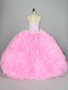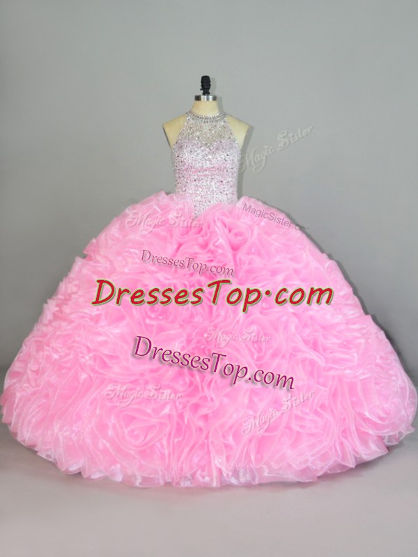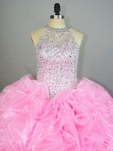 Baby Pink Ball Gowns Organza Halter Top Sleeveless Beading and Ruffles Floor Length Lace Up 15 Quinceanera Dress
