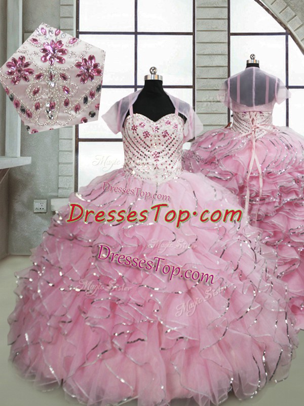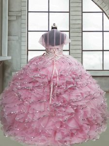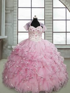 Baby Pink Ball Gowns Organza Spaghetti Straps Sleeveless Beading and Ruffles Lace Up Pageant Dress Womens Brush Train