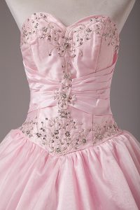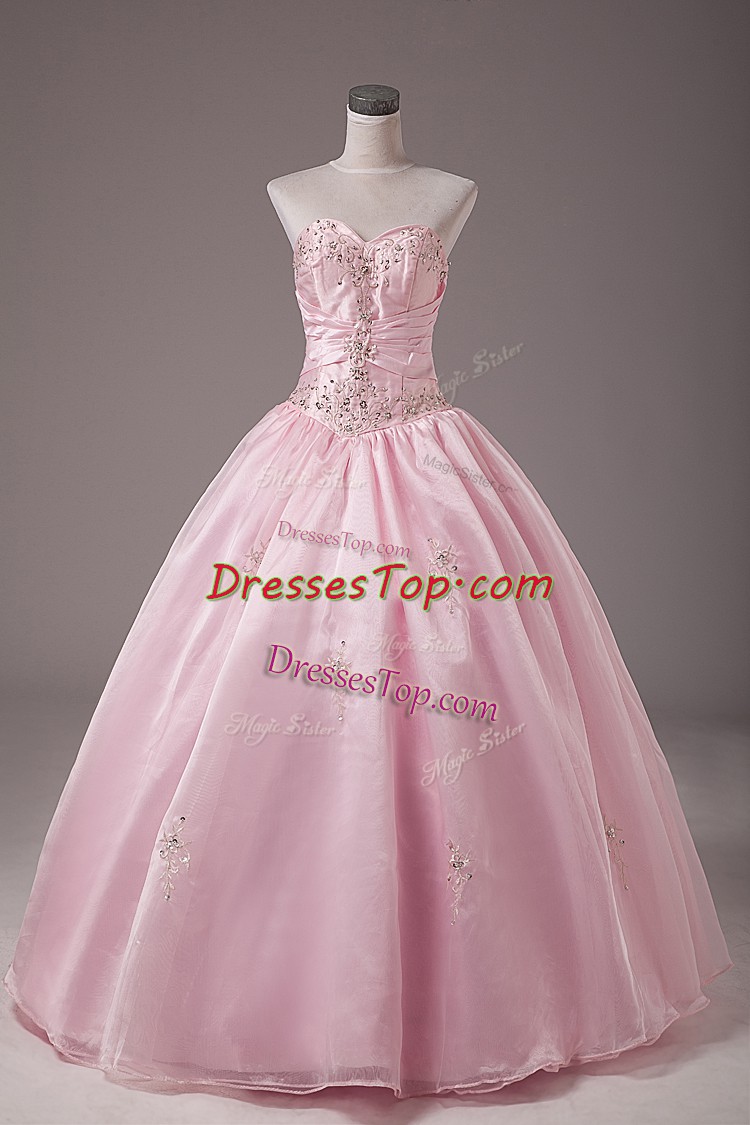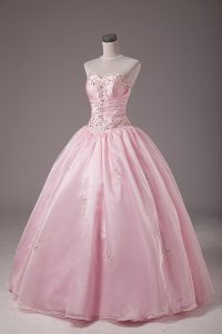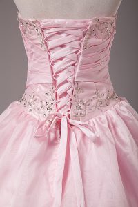 Baby Pink Ball Gowns Strapless Sleeveless Organza Floor Length Lace Up Beading and Embroidery Quinceanera Dress