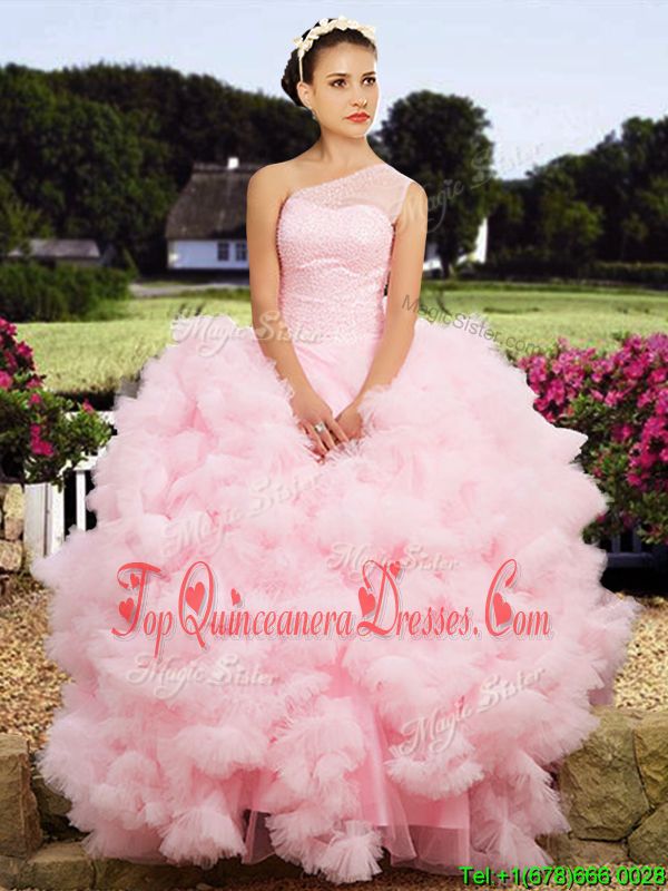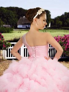 Baby Pink Quinceanera Dress Military Ball and Sweet 16 and Quinceanera and For with Beading One Shoulder Sleeveless Lace Up