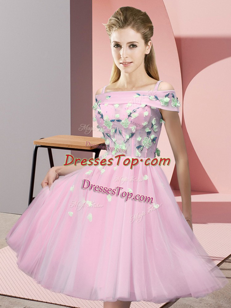Baby Pink Short Sleeves Knee Length Appliques Lace Up Quinceanera Court of Honor Dress