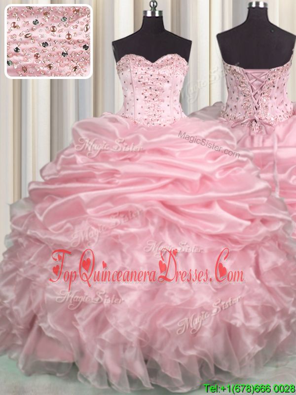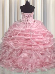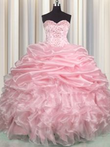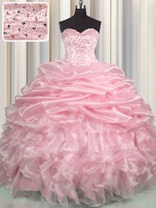Baby Pink Sweet 16 Dress Military Ball and Sweet 16 and Quinceanera and For with Beading and Ruffles and Pick Ups Sweetheart Sleeveless Brush Train Lace Up