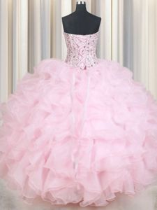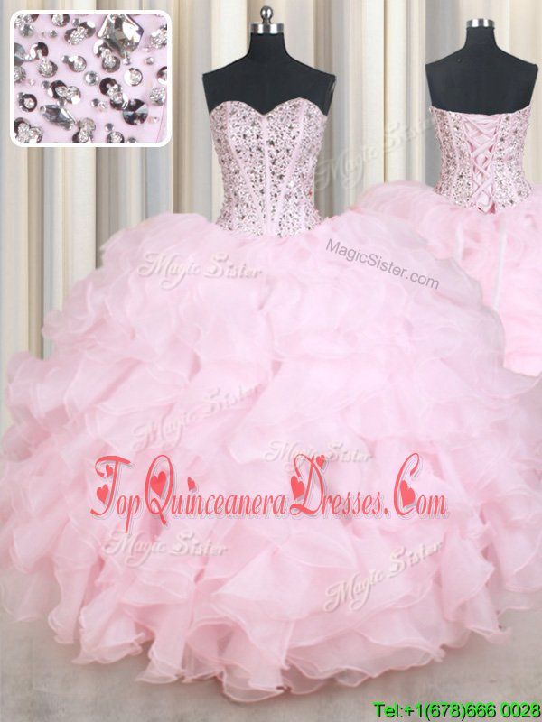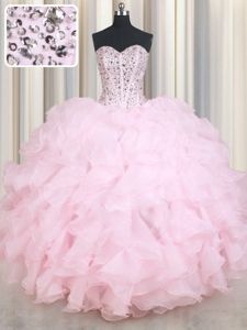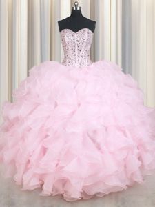 Baby Pink Sweetheart Lace Up Beading and Ruffles Quince Ball Gowns Sleeveless