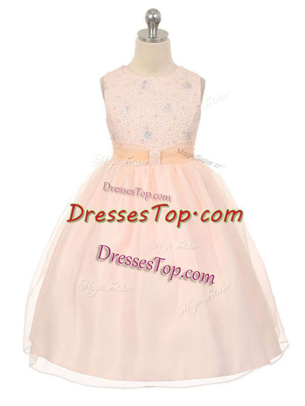 Baby Pink Tulle Lace Up Girls Pageant Dresses Sleeveless Knee Length Beading
