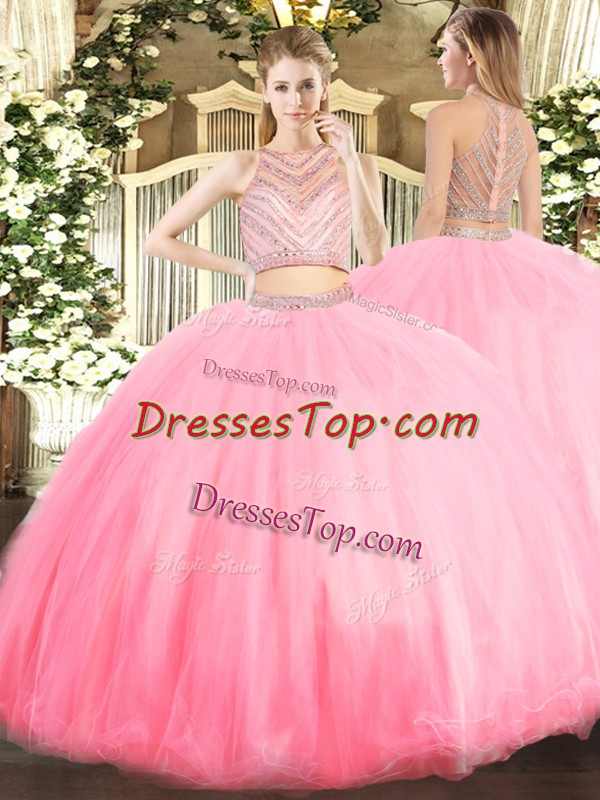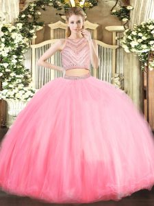Baby Pink Tulle Zipper Scoop Sleeveless Floor Length Vestidos de Quinceanera Beading