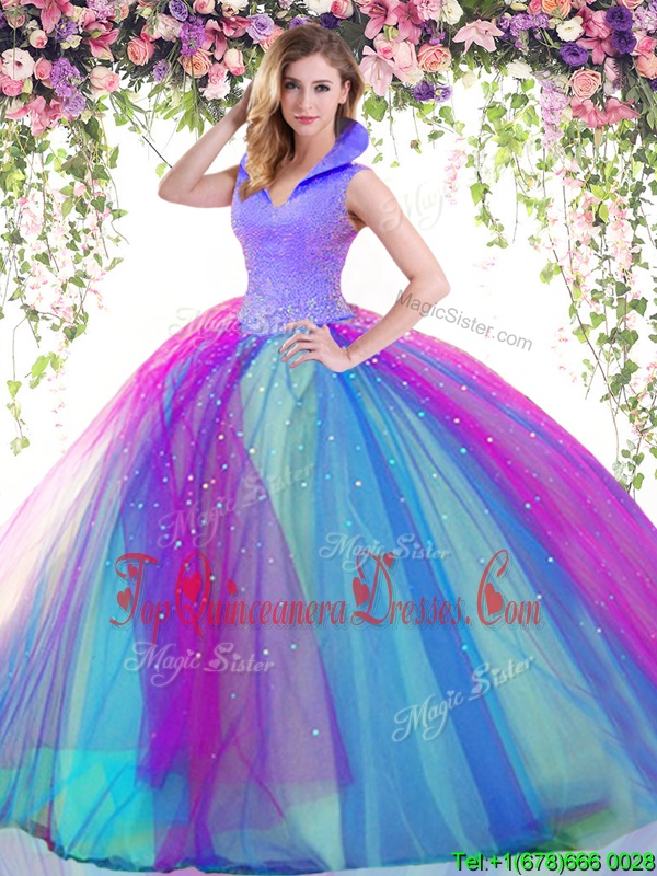 Backless Multi-color Sleeveless Beading Floor Length Quinceanera Gown