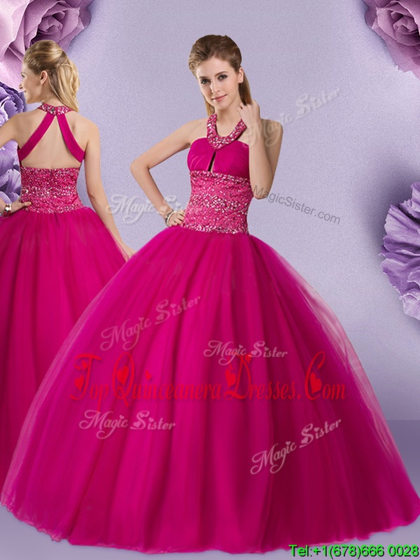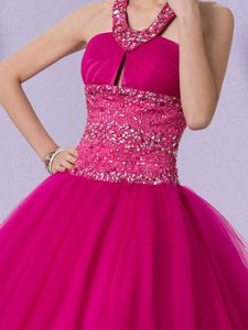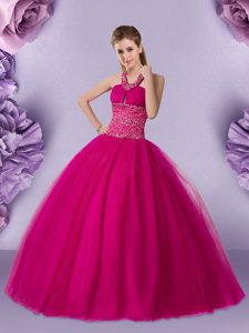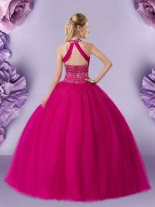 Ball Gowns 15 Quinceanera Dress Fuchsia Halter Top Tulle Sleeveless Floor Length Lace Up