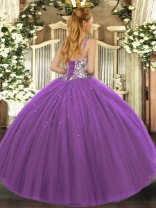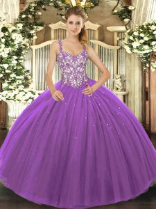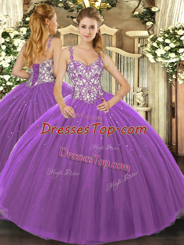 Ball Gowns 15th Birthday Dress Purple Straps Tulle Sleeveless Floor Length Lace Up