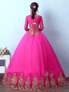 Ball Gowns Ball Gown Prom Dress Fuchsia Scoop Tulle Long Sleeves Floor Length Lace Up