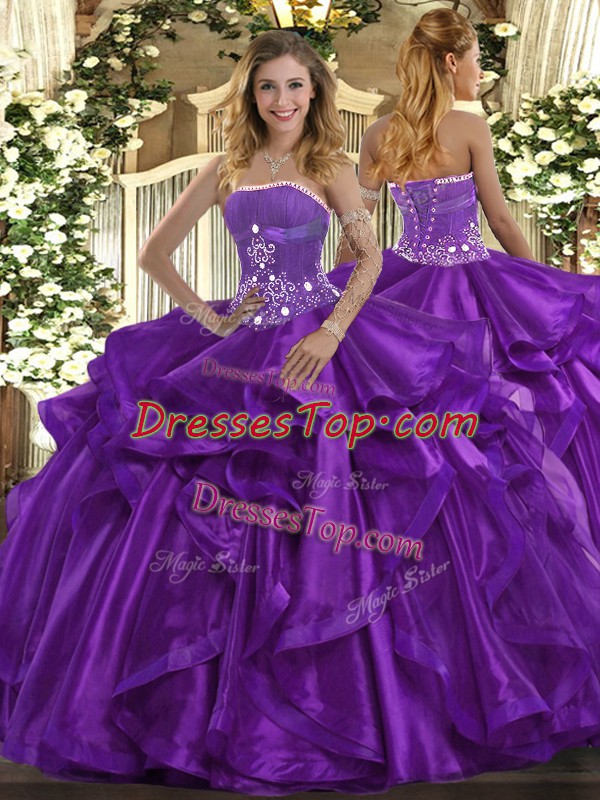 Ball Gowns Ball Gown Prom Dress Purple Strapless Organza Sleeveless Floor Length Lace Up