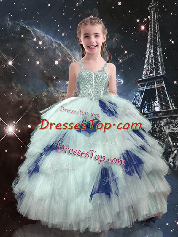 Ball Gowns Kids Formal Wear White Straps Tulle Sleeveless Floor Length Lace Up