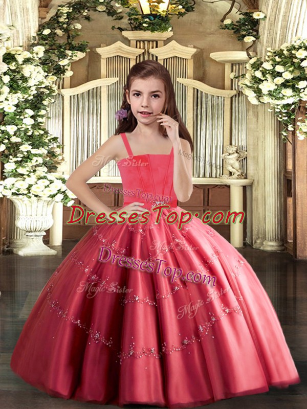Ball Gowns Kids Pageant Dress Coral Red Straps Tulle Sleeveless Floor Length Lace Up