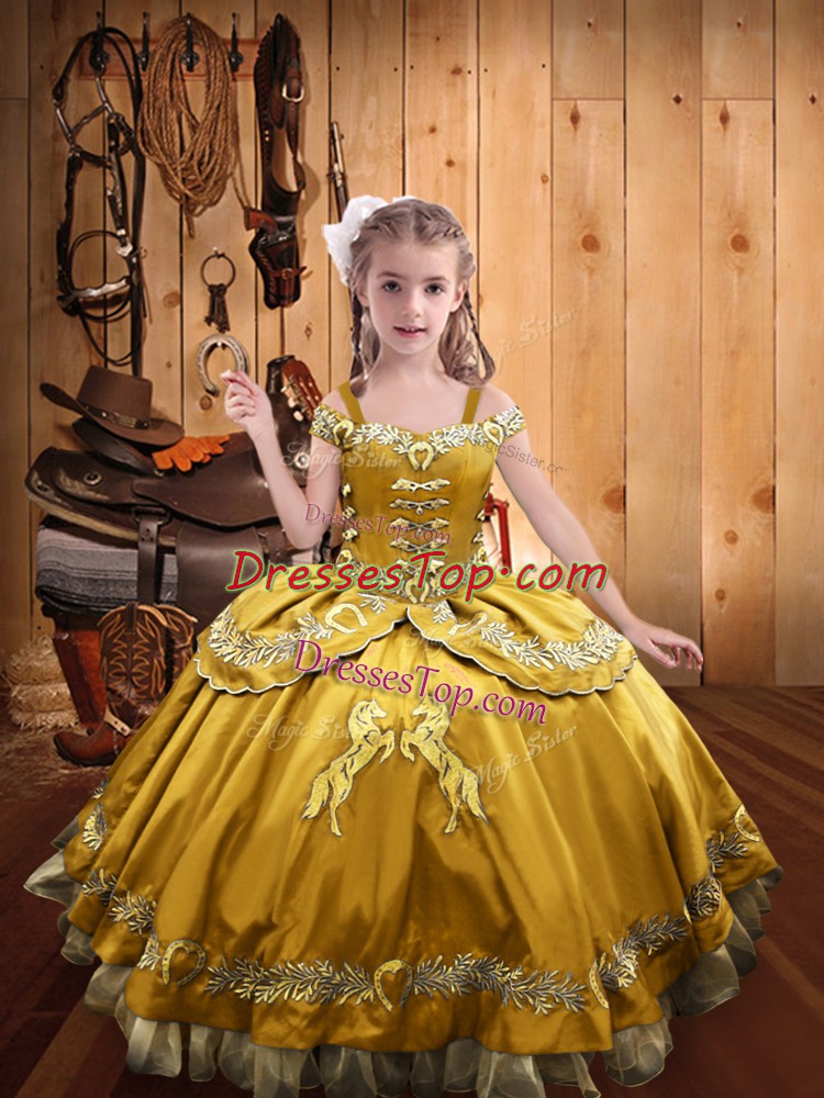 Ball Gowns Little Girls Pageant Dress Gold Off The Shoulder Satin Sleeveless Floor Length Lace Up