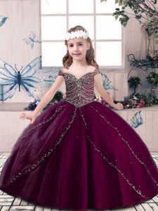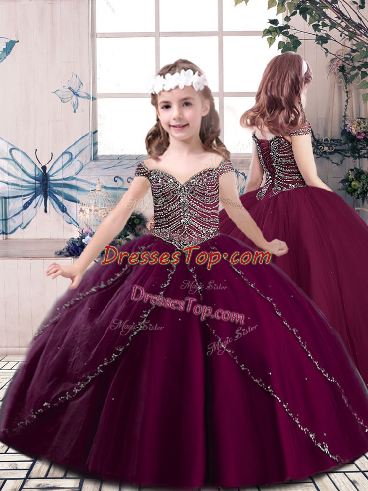 Ball Gowns Little Girls Pageant Dress Wholesale Burgundy Straps Tulle Sleeveless Floor Length Lace Up