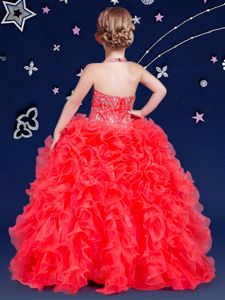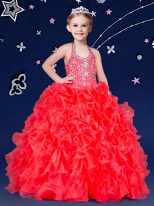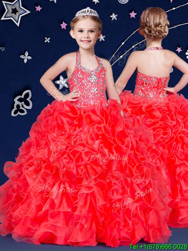 Ball Gowns Pageant Dress Toddler Coral Red Halter Top Organza Sleeveless Floor Length Zipper