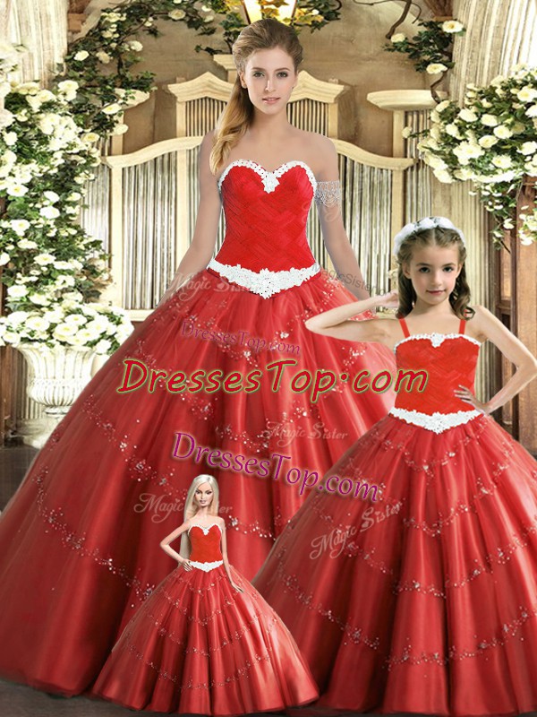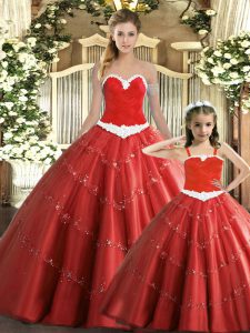 Ball Gowns Quince Ball Gowns Red Sweetheart Tulle Sleeveless Floor Length Lace Up