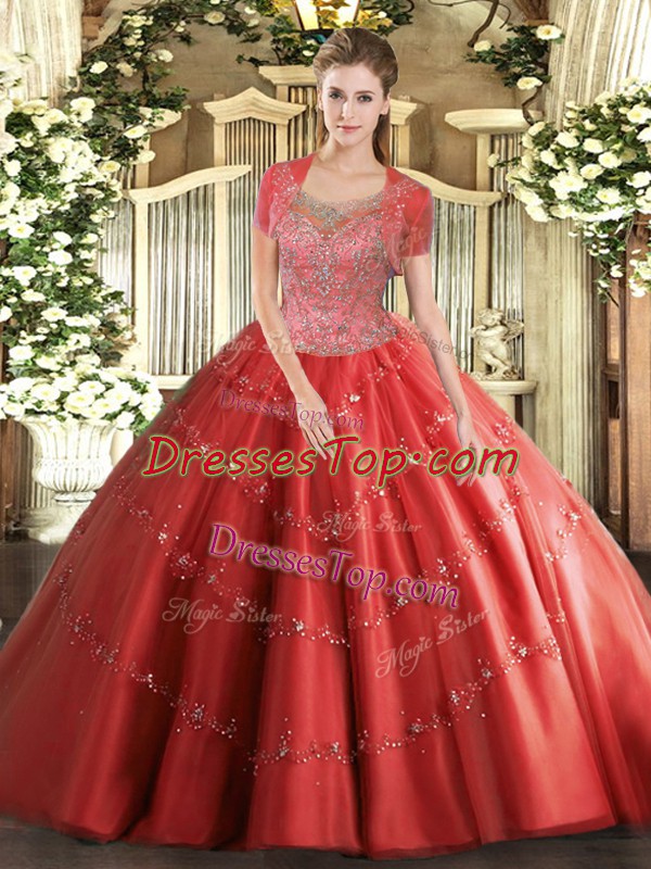 Ball Gowns Quinceanera Dress Coral Red Scoop Tulle Sleeveless Floor Length Clasp Handle