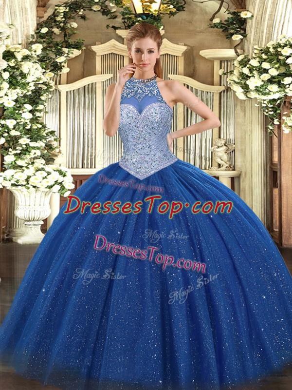 Ball Gowns Quinceanera Dress Royal Blue Halter Top Tulle Sleeveless Floor Length Lace Up