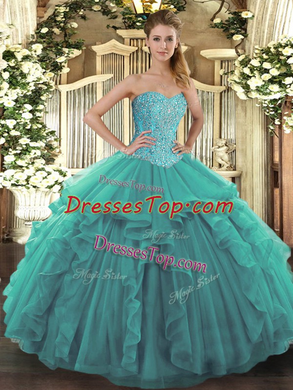 Ball Gowns Quinceanera Dresses Turquoise Sweetheart Tulle Sleeveless Floor Length Lace Up