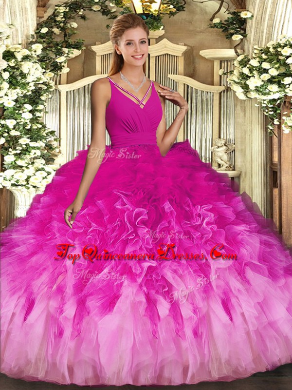 Ball Gowns Quinceanera Gown Multi-color V-neck Tulle Sleeveless Floor Length Backless