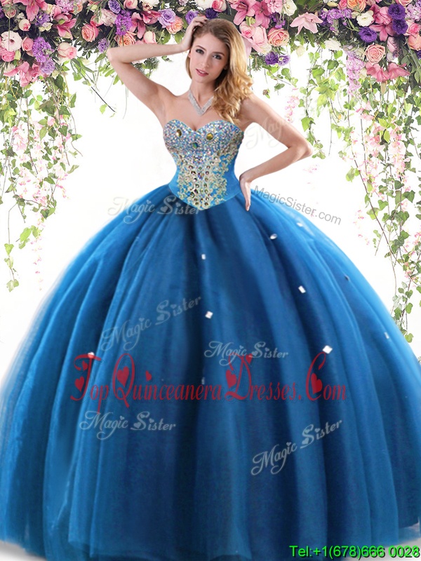 Ball Gowns Quinceanera Gowns Blue Sweetheart Tulle Sleeveless Floor Length Lace Up