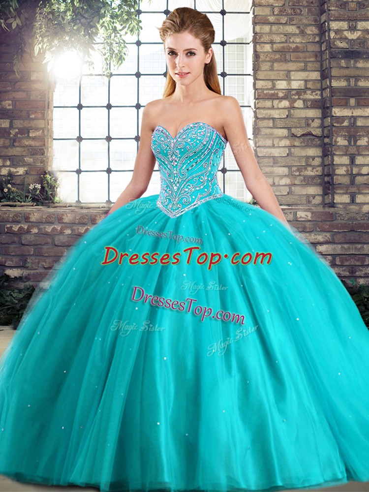 Ball Gowns Sleeveless Aqua Blue Quinceanera Gowns Brush Train Lace Up