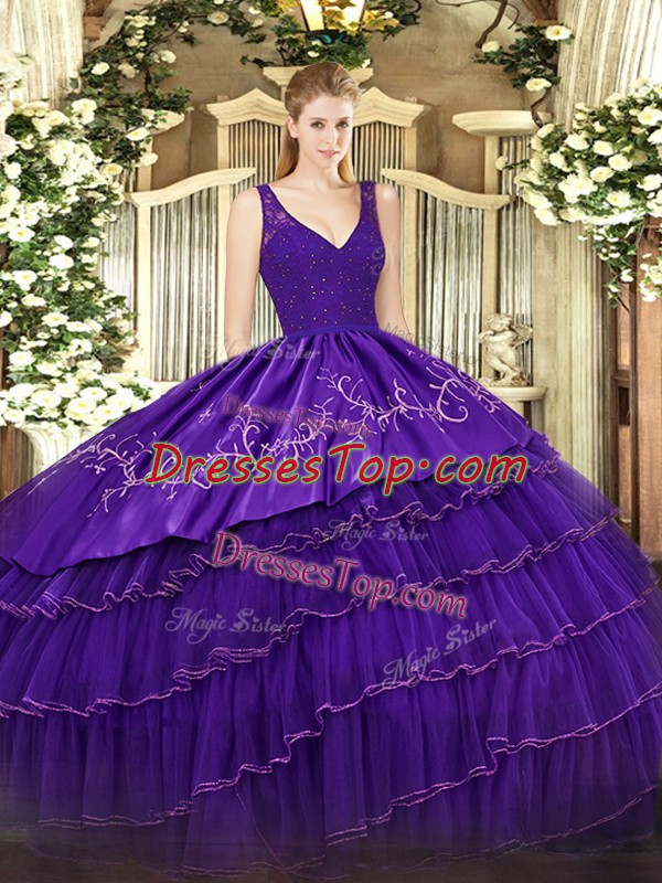 Ball Gowns Sweet 16 Dresses Purple V-neck Satin and Tulle Sleeveless Floor Length Zipper