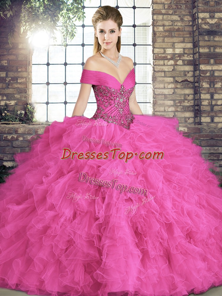 Ball Gowns Sweet 16 Quinceanera Dress Hot Pink Off The Shoulder Tulle Sleeveless Floor Length Lace Up