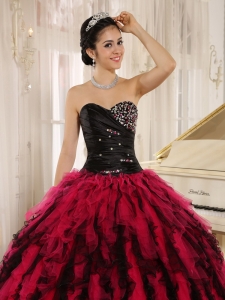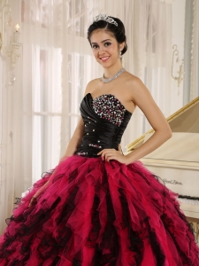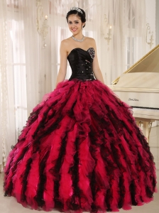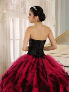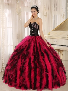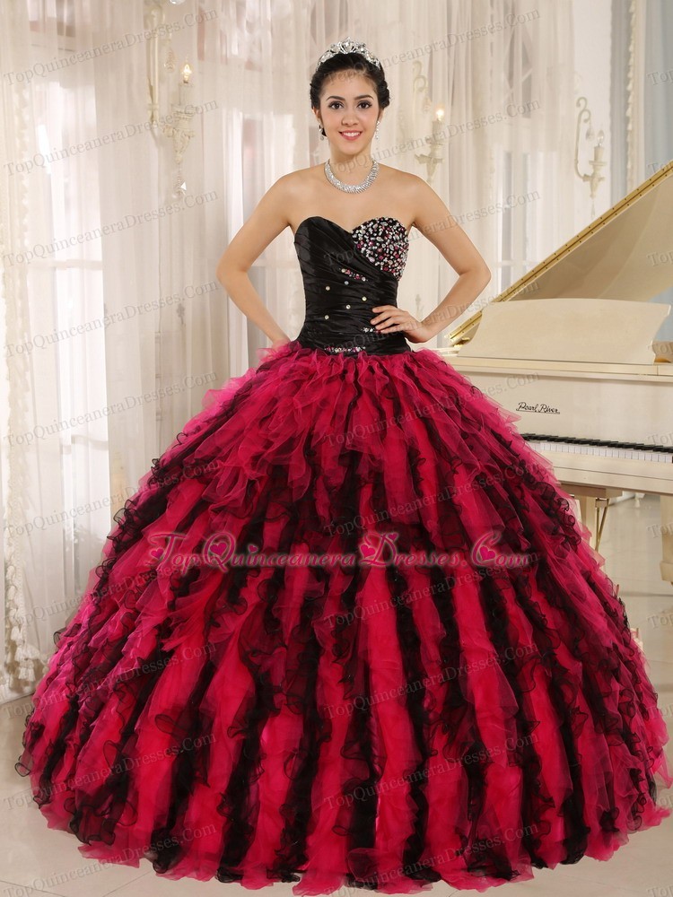 Beaded Ruffled Sweetheart Black and Hot Pink Quince Dress